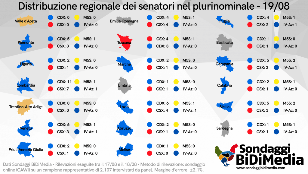 il M5S otterrebbe così 1 seggio in Lombardia, Piemonte, Veneto, Emilia, Toscana, Lazio, Puglia, Calabria e Sardegna, mentre arriverebbe a 2 eletti solo nelle due regioni in cui è più forte: Campania e Sicilia. Il “Polo Liberale” Renzi-Calenda soffre più di tutti, riuscendo ad ottenere appena 5 senatori eletti 1 per regione in Lombardia, Veneto, Lazio, Puglia e Campania.