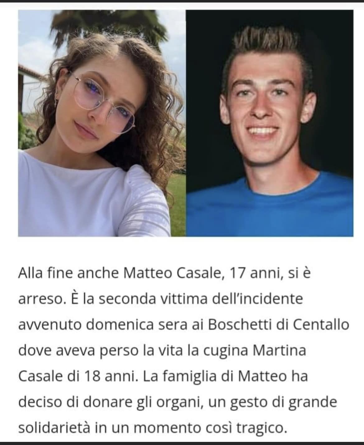 I genitori di Matteo Casale, il ragazzo 17enne morto ieri, dopo l’incidete di domenica 9 ottobre a Centallo, hanno acconsentito all’espianto degli organi del figlio.