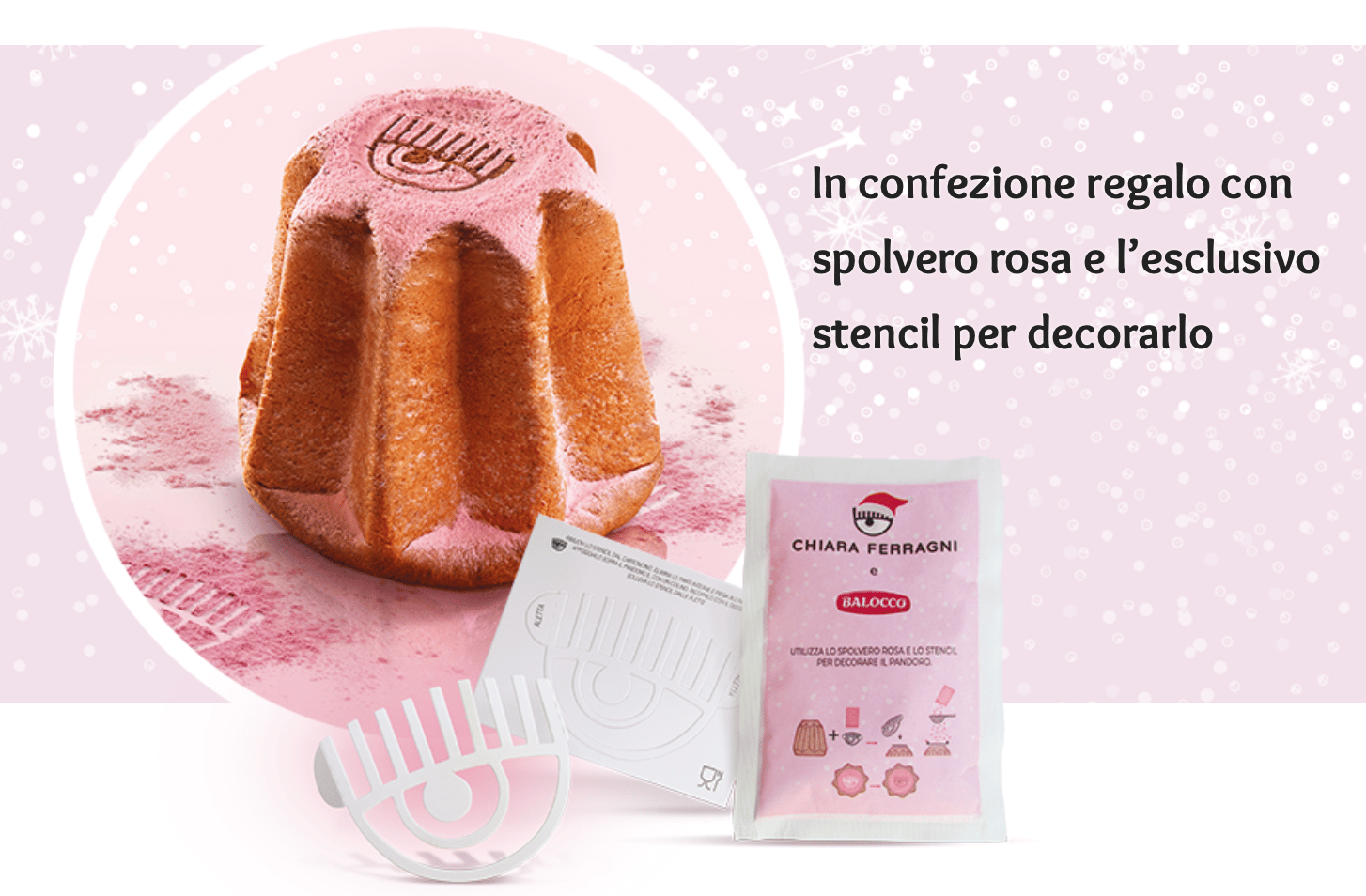 Nella confezione regalo verrà inserito lo spolvero rosa e l’esclusivo stencil per decorarlo.