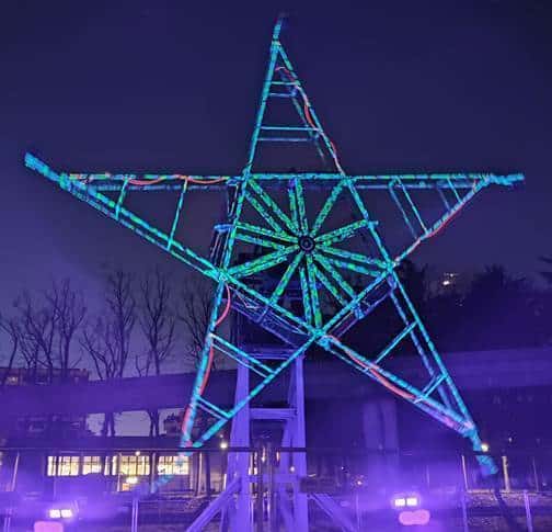 L’opera di Zorio è una stella a cinque punte di oltre undici metri di diametro che, sorretta da un braccio verticale, ruota come un mulino sfiorando il pelo dell’acqua e generando così piccole cascate continue. Ricoperta di fosforo, al buio assume una colorazione verde.