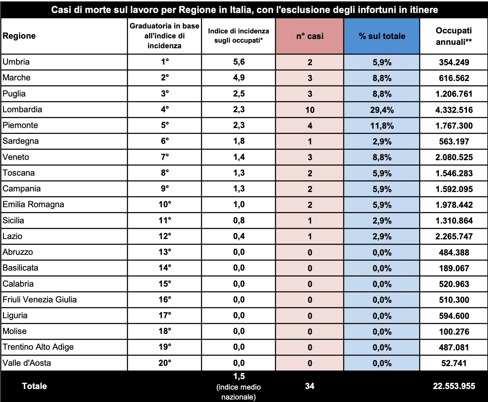 Sempre in cima alla graduatoria con il maggior numero di vittime in occasione di lavoro è –inevitabilmente a livello statistico – la regione con la più alta popolazione lavorativa d’Italia, cioè la Lombardia (10). Seguono: Piemonte (4), Veneto, Marche e Puglia (3), Umbria, Toscana, Campania ed Emilia Romagna (2), Sardegna, Sicilia e Lazio (1).