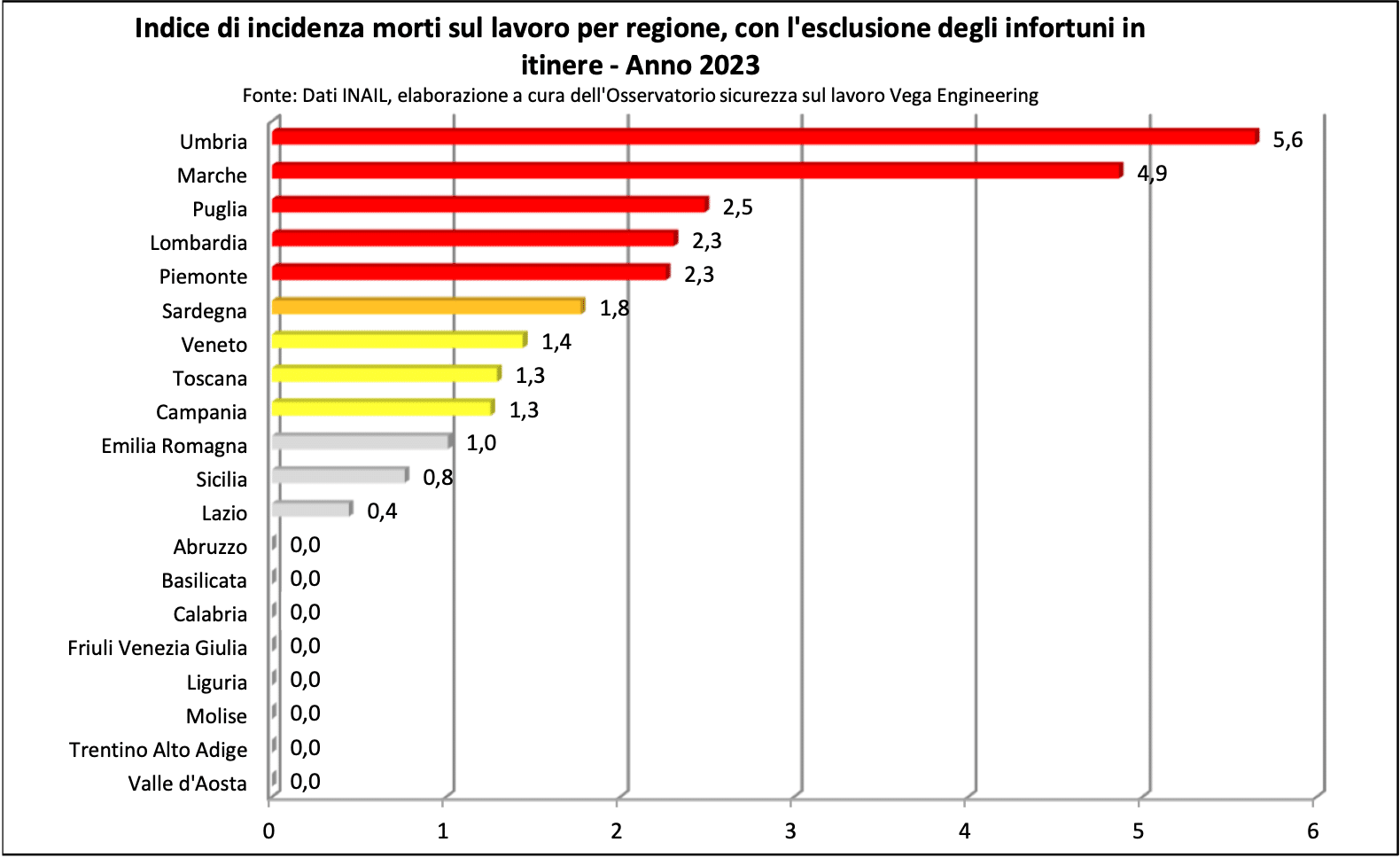C’è anche il Piemonte tra le regioni italiane che si piazzano nella zona rossa per quanto riguarda le vittime sul lavoro. Lo rileva l’Osservatorio Sicurezza sul Lavoro Vega.