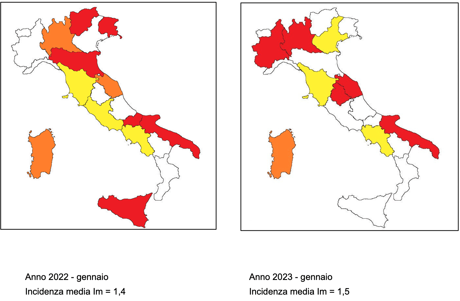 A finire in zona rossa a gennaio 2023 con un’incidenza superiore a +25% rispetto alla media nazionale sono: Umbria, Marche, Puglia, Lombardia e Piemonte. In zona arancione: Sardegna. In zona gialla: Veneto, Toscana e Campania. In zona bianca: Emilia Romagna, Sicilia, Lazio, Abruzzo, Basilicata, Calabria, Friuli Venezia Giulia, Liguria, Molise, Trentino Alto Adige e Valle D’Aosta.