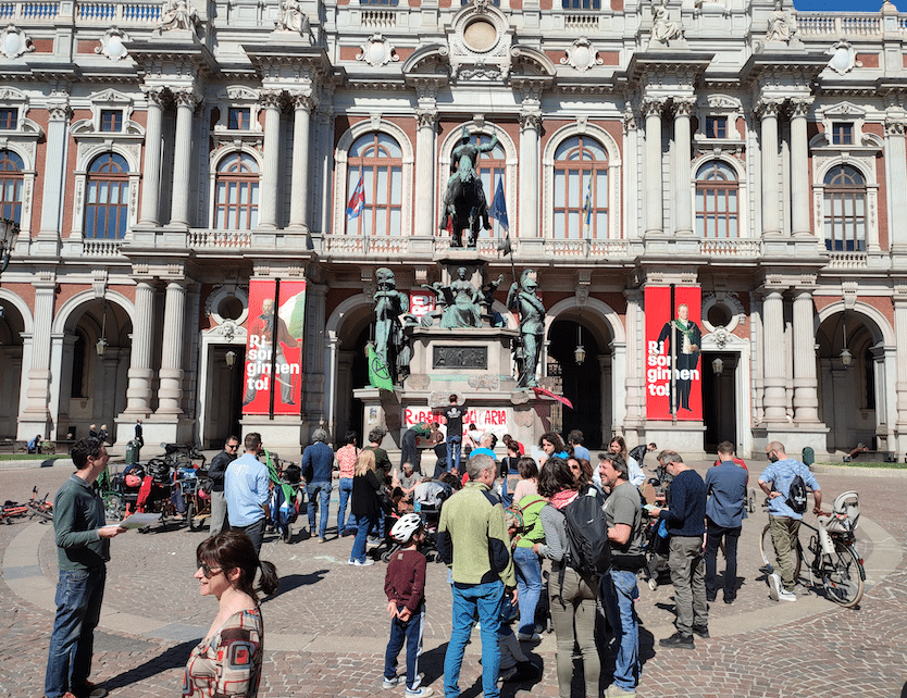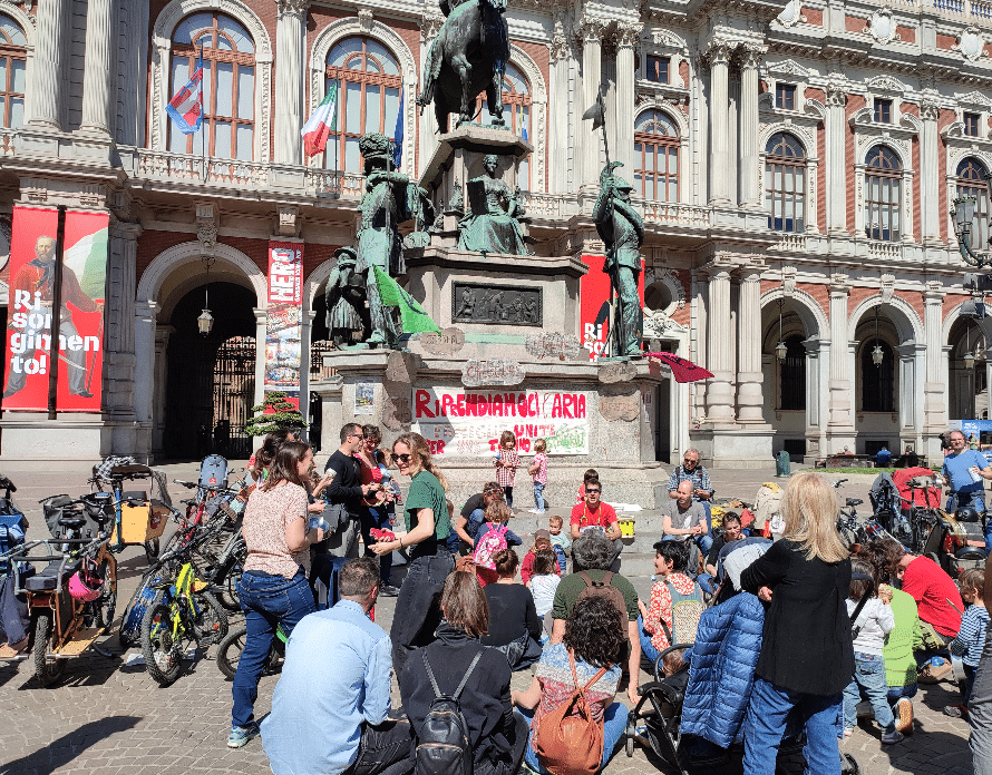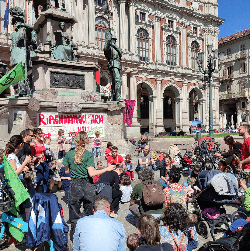 “Riprendiamoci l’aria”, gli Extinction Rebellion si riuniscono con le famiglie in piazza Carlo Alberto a Torino