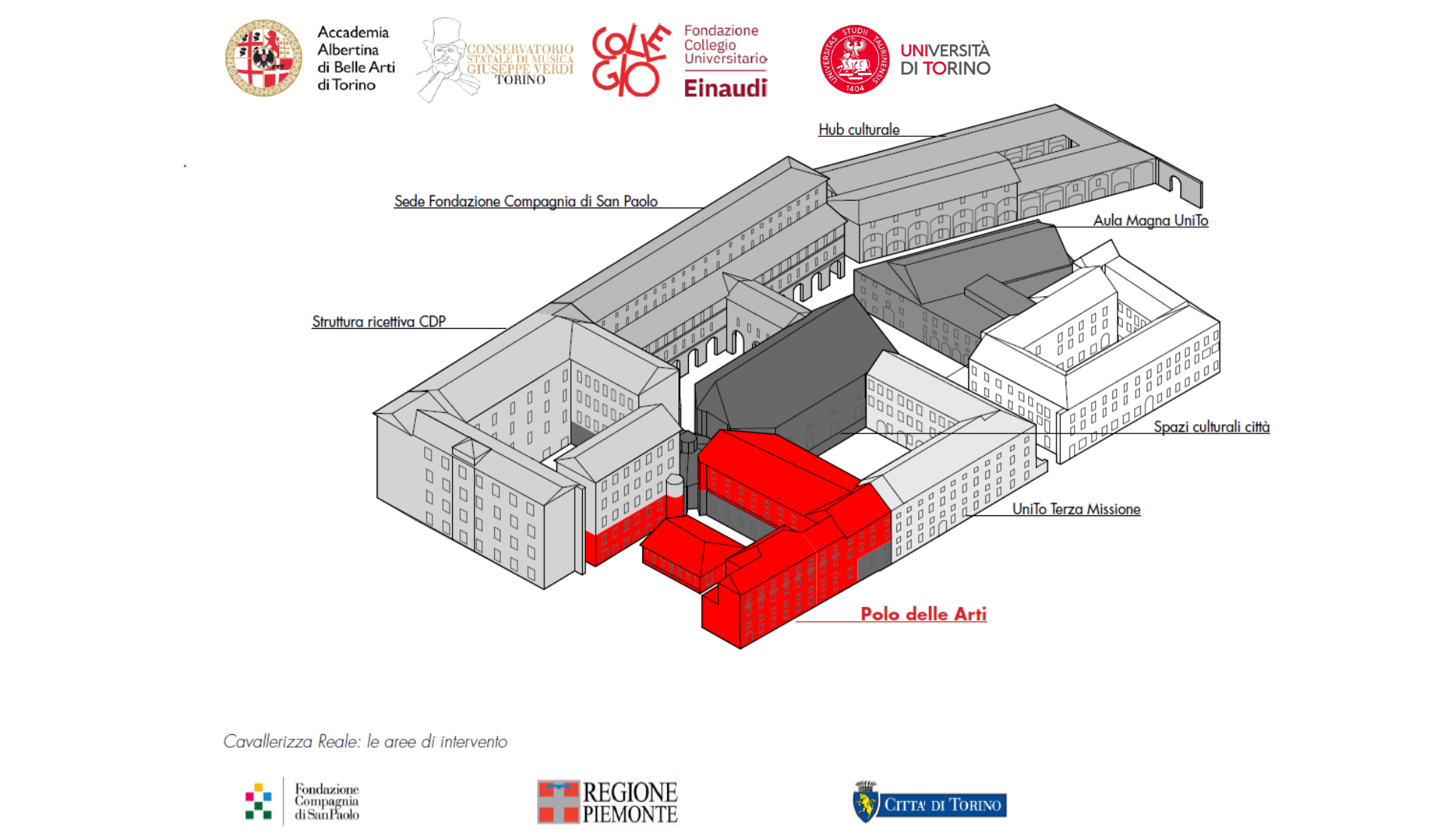 Un’iniziativa di ampio respiro che riunisce le principali istituzioni pubbliche e private del territorio, Regione Piemonte, Città di Torino, Fondazione Compagnia di San Paolo, Università degli Studi di Torino, Accademia Albertina di Belle Arti, Conservatorio Giuseppe Verdi di Torino e Fondazione Collegio Universitario Einaudi, decise a fare sistema per regalare a Torino una realtà unica in Italia.