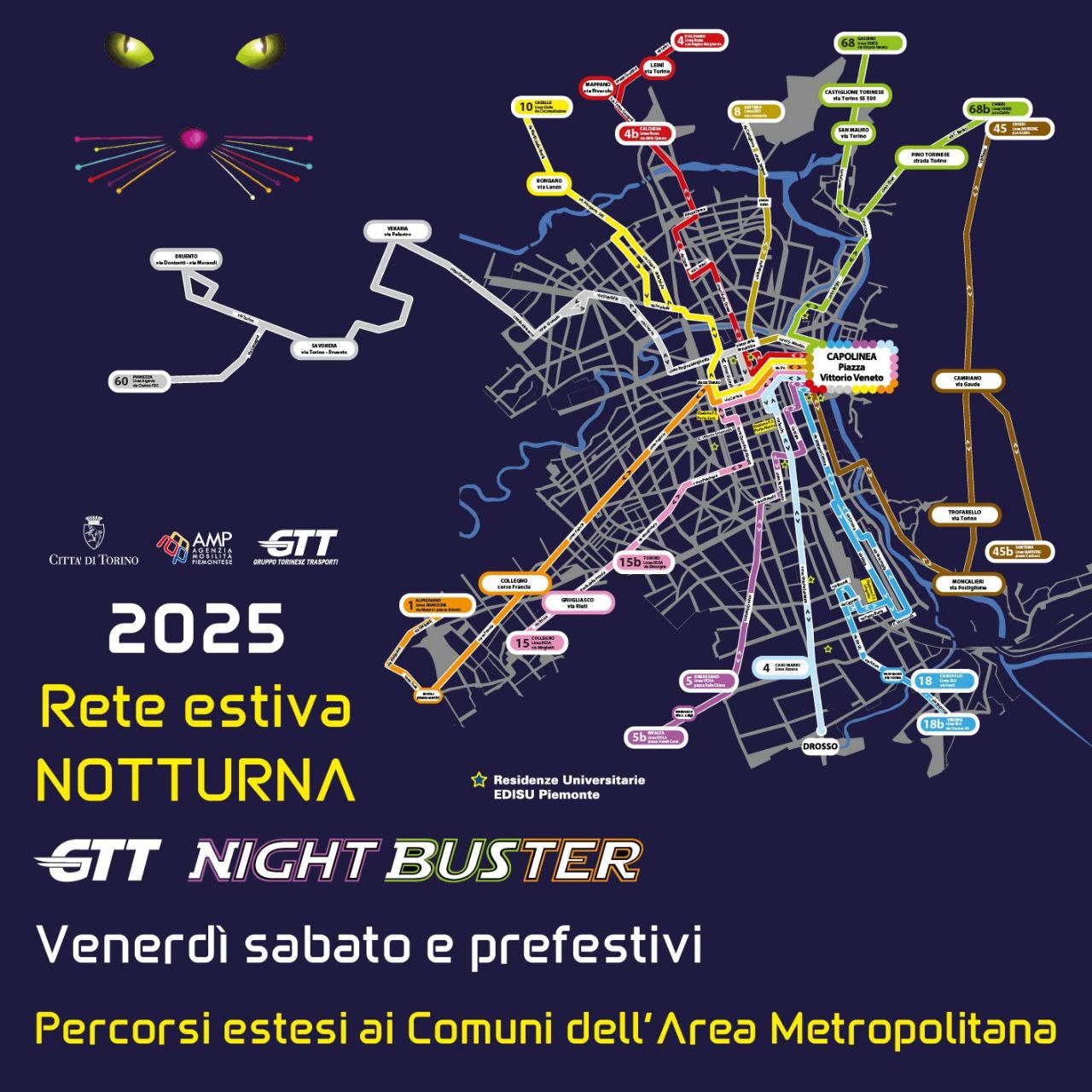 Night Buster 2025 torna a Torino: 17 linee attive ogni weekend fino al 7 settembre per collegare la città con i Comuni dell’area metropolitana in modo sicuro e sostenibile.