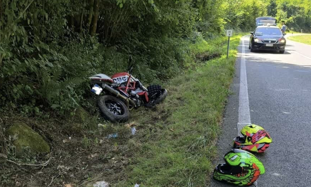 Ducati Monster finisce fuori strada a San Martino Canavese: feriti un uomo di 46 anni e una donna di 35.