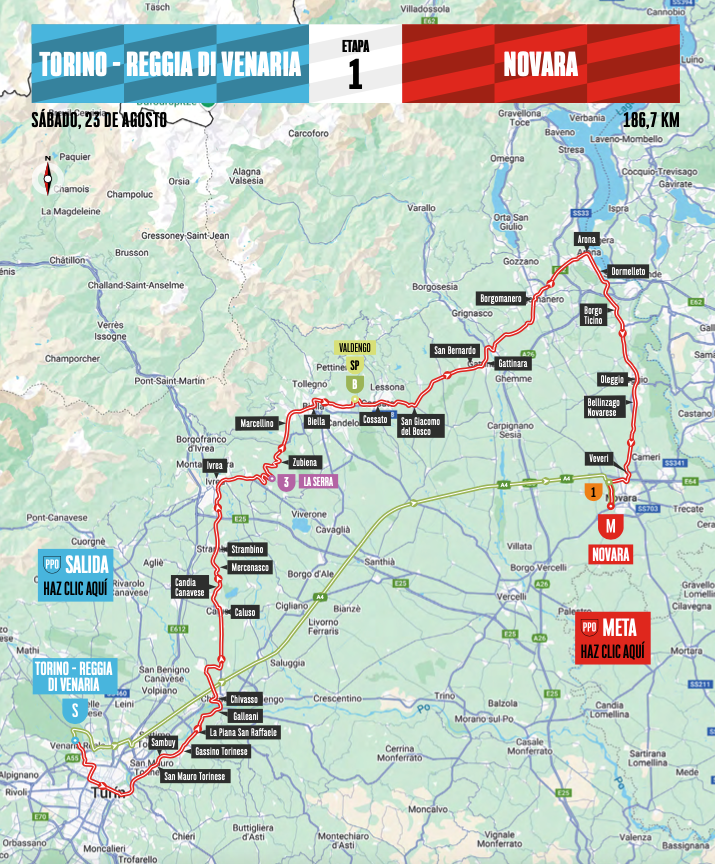 La Vuelta parte dal Piemonte: la prima tappa dalla Reggia di Venaria a Torino, verso Ivrea, la Serra, Biella, Borgomanero e arrivo a Novara