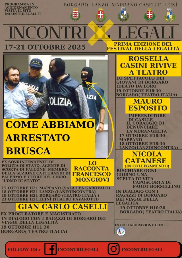 BORGARO TORINESE – Dal 17 al 21 ottobre 2025, i Comuni di Borgaro Torinese, Mappano, Lanzo Torinese e Leinì si uniscono per ospitare la prima edizione del Festival della Legalità, intitolato “Incontri Legali”. Una settimana di eventi, testimonianze e dialoghi con protagonisti della lotta alla criminalità organizzata, per ribadire con forza un “no” deciso alle mafie e promuovere la cultura della legalità nel territorio a nord di Torino.