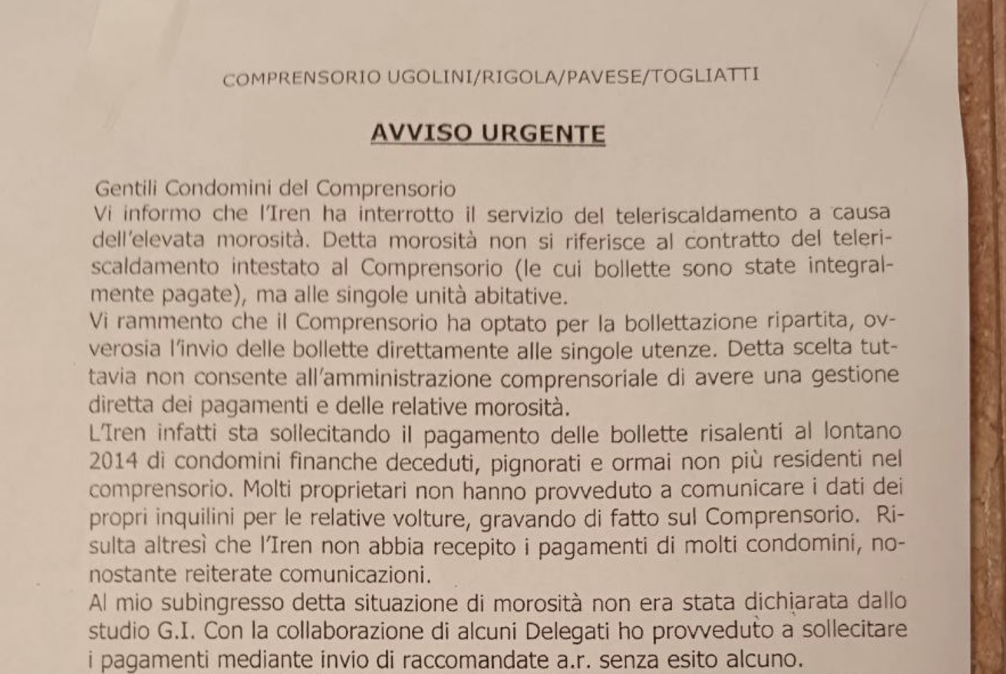 Nel frattempo, ai condomini morosi è stato chiesto di saldare le proprie posizioni direttamente a Iren tramite bonifico bancario, allegando la contabile all’amministrazione per evitare l’avvio di pratiche di recupero crediti.