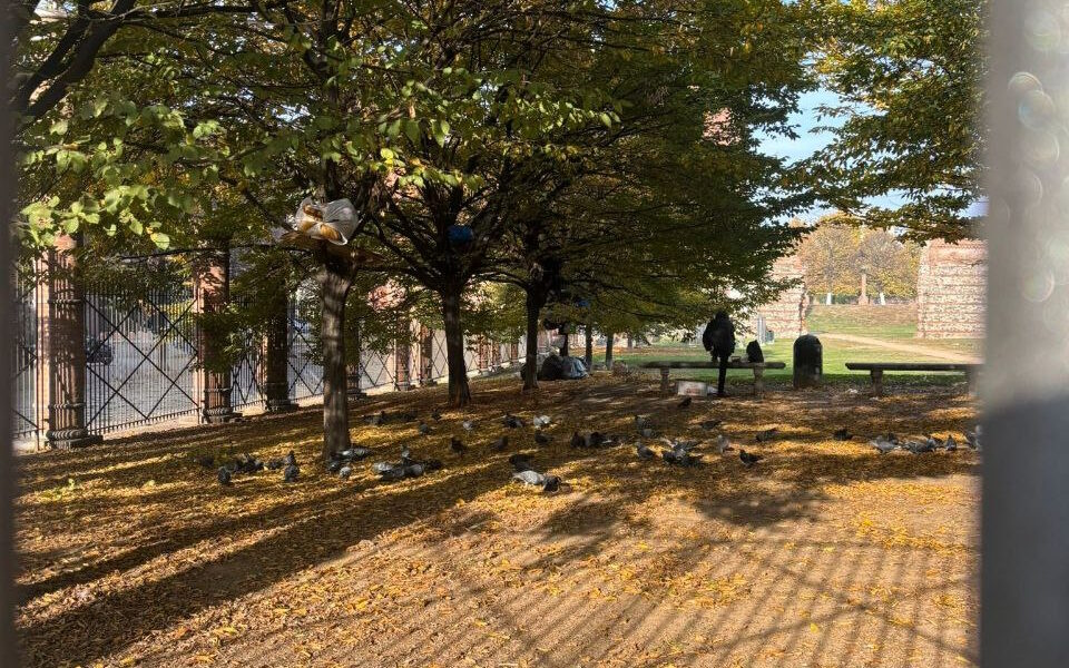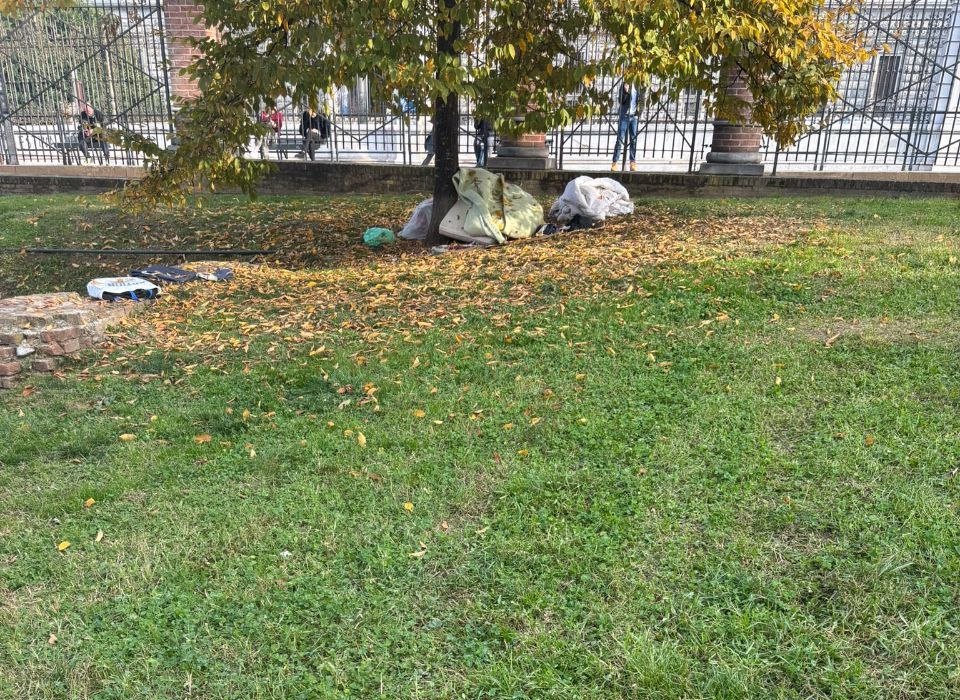 Tra i luoghi diventati “residenza per senzatetto” c’è anche il parco delle Porte Palatine, dove cartoni e coperte occupano il giordino e sono perfino ordinatamente posati sugli alberi in attesa di essere utilizzati per la notte.