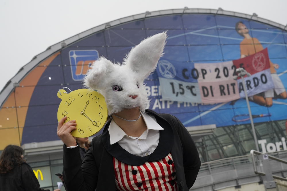 Sul marciapiede, intanto, decine di persone si sono radunate per un presidio informativo rivolto ai passanti. A catturare l’attenzione c’era anche una figura surreale: una persona travestita da Bianconiglio, che continuava a ripetere “È tardi”, guardando nervosamente un orologio da taschino. Un gesto ironico per ribadire, a modo loro, che sul clima il tempo utile è già scaduto.