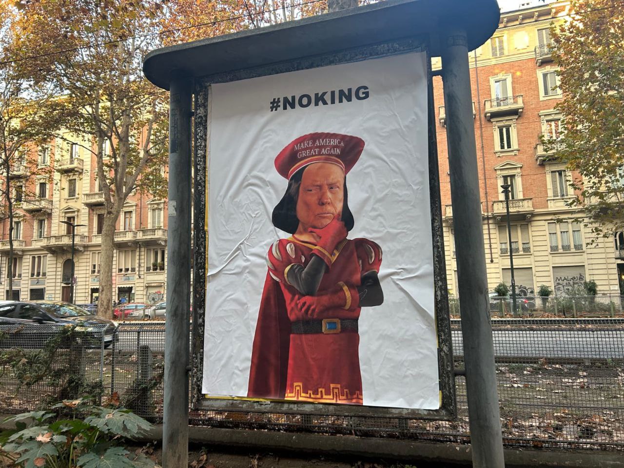 “Questo poster, – spiega Andrea Villa – che raffigura Donald Trump come un vanesio Lord Farquaad di Shrek con il berretto “Make America Great Again” e lo slogan “#NOKING”, mette in evidenza la megalomania e il potere teatrale del populismo trumpiano”.