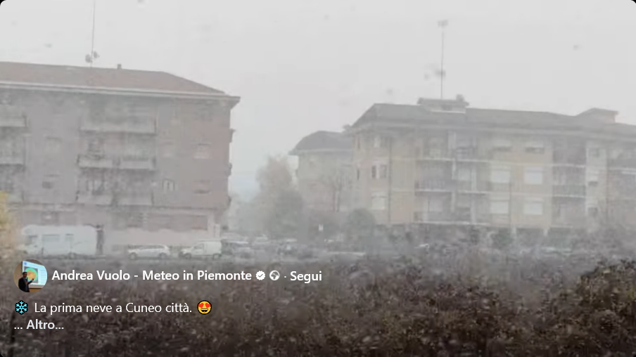 CUNEO – Come spesso accade è stata Cuneo ad inaugurare la stagione della neve nei capoluoghi di provincia in Piemonte. Da questa mattina nevica in città in maniera copiosa, anche se è probabile che non ci saranno alla fine accumuli superiori ai 5 cm.
