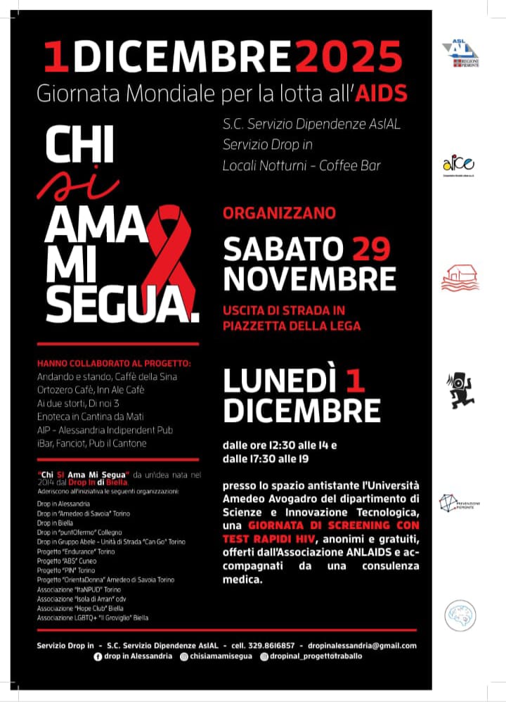 ALESSANDRIA – In occasione della Giornata Mondiale di Lotta contro l’AIDS, che si terrà il 1° dicembre 2025, l’ASL AL promuove una serie di iniziative dedicate alla prevenzione e alla corretta informazione. Al centro delle attività c’è la campagna regionale “Chi si ama mi segua”, diffusa sul territorio dal Drop In di Alessandria, servizio a bassa soglia della SC SerD e gestito dalla Cooperativa Alice insieme all’Associazione Comunità San Benedetto al Porto APS.