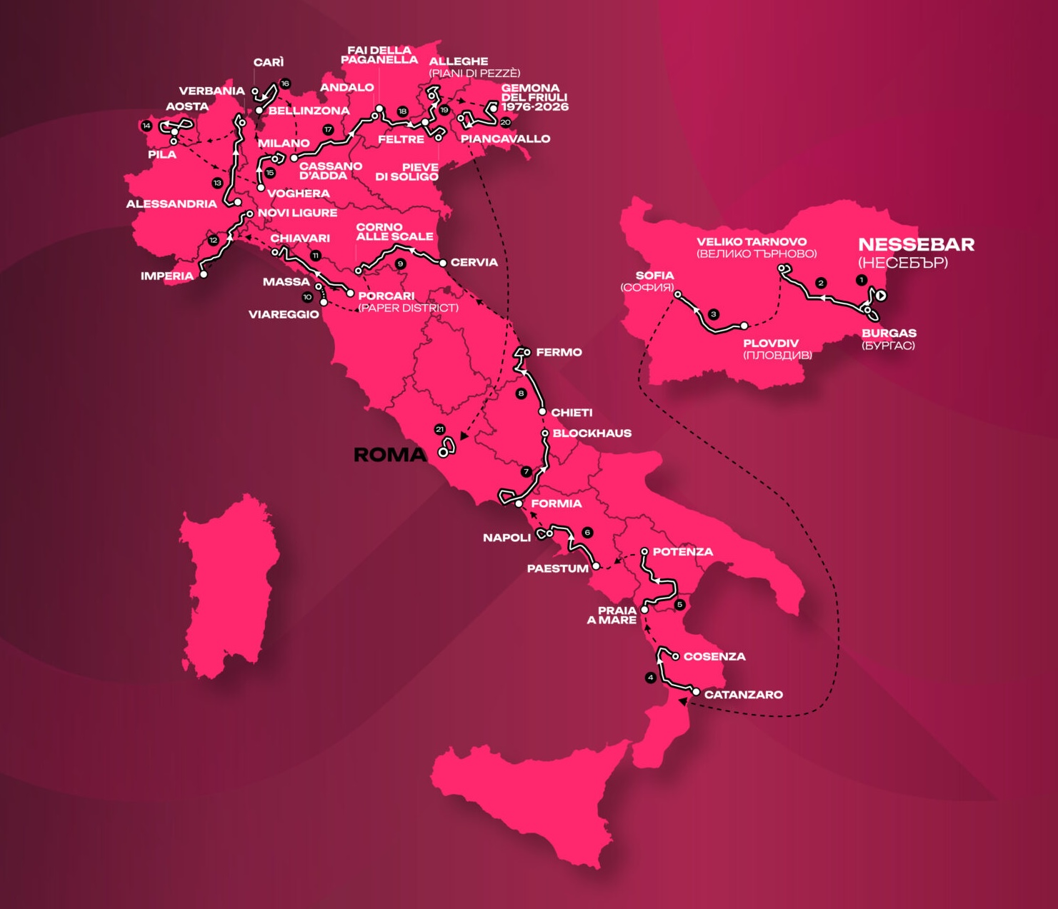 La Grande partenza del Giro 2026 sarà dalla Bulgaria. Il Giro rientrerà in Italia in Calabria a Catanzaro per poi risalire lo stivale ed arrivare fino in Piemonte giovedì 21 maggio con la Imperia – Novi Ligure (177 km) che entra in regione dal Sassello per poi scendere verso il novese. Il giorno successivo venerdì 22 maggio si parte da Alessandria per attraversare la regione da sud a nord fino al lago Maggiore e arrivare a Verbania dopo 186 km. Sabato 23 maggio il giro passa in Valle d’Aosta con una tappa che la attraversa secondo diverse direzioni la Aosta – Pila di 133 km.