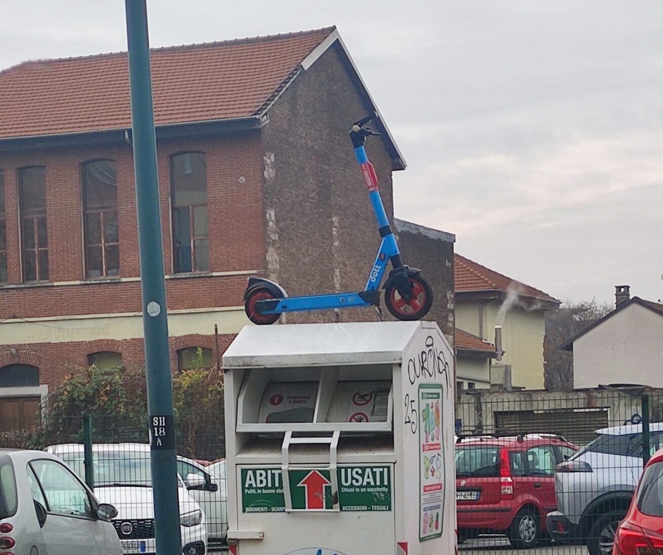 Monopattini ovunque a Torino, anche sui bidoni della raccolta abiti usati