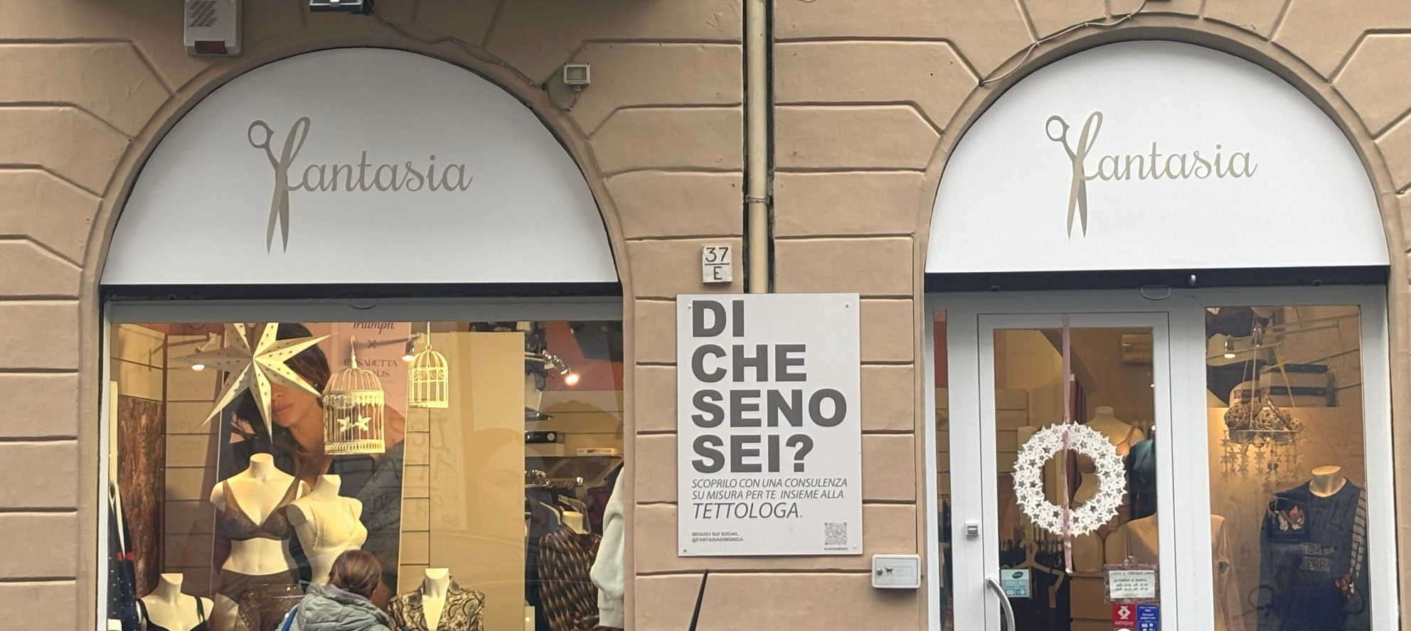 Nonostante il negozio sia aperto da più di quarant’anni, solo di recente è apparso in vetrina un curiosissimo cartello, che chiede ai passanti: “Di che seno sei?”.