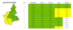 Per questo, in relazione ai fenomeni attesi, il Centro Funzionale Arpa Piemonte ha emesso una allerta gialla per neve e valangheper oggi ed estesa alla giornata di domani, giorno di Natale, su alcune zone del Piemonte. Fino al mattino di Santo Stefano, scrive Arpa, precipitazioni moderate diffuse sul Piemonte occidentale, localmente forti nelle vallate del Cuneese e del Torinese. Quota neve in calo già oggi dai 1000-1100 m fino a quote collinari, con valori inferiori su Cuneese, Langhe, Roero e collina torinese, fino a 400-600 m.