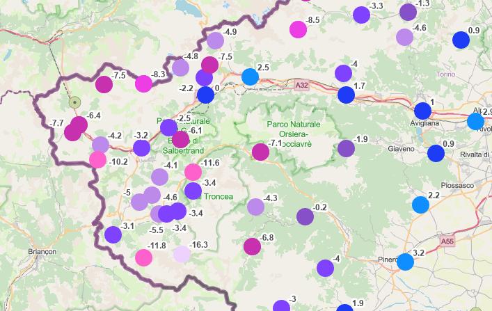 Il Centro Meteo Piemonte segnala un brusco calo termico con valori fino a oltre 15 gradi in meno rispetto a domenica e minime sotto i -16°C