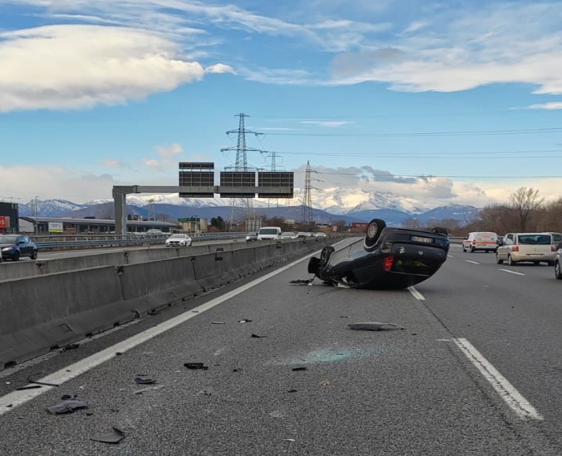 Scontro tra due auto sulla Tangenziale Sud a Stupinigi, si ribalta una delle due