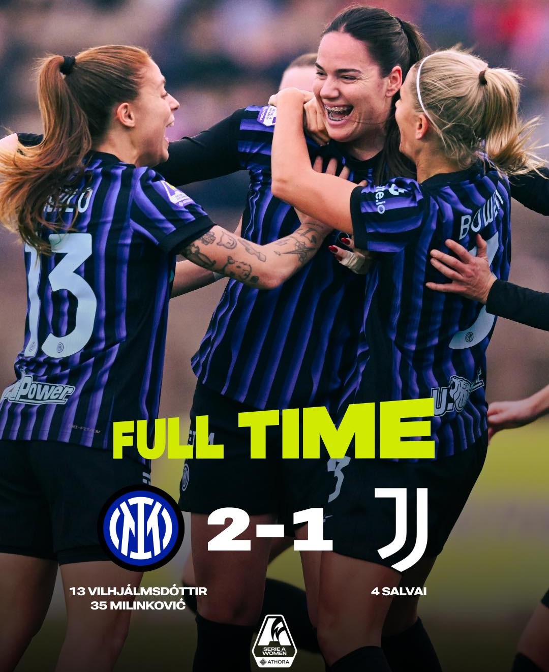 Nella ripresa la Juventus alza il baricentro alla ricerca del pareggio, ma dopo una occasione iniziale delle ospiti con Vangsgaard l’Inter difende con ordine e compattezza, concedendo pochissimo e portando a casa i tre punti in rimonta. Il successo permette alla squadra di Gianpiero Piovani di scavalcare la Juventus stessa e di salire al secondo posto in classifica, alle spalle di una Roma saldamente in testa con 7 punti di vantaggio. Per la Juventus invece ora la vetta dista otto lunghezze.