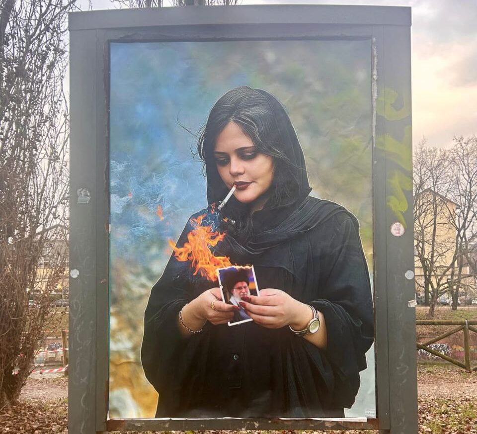 TORINO – E’ stato affisso a Torino in Lungo Dora Siena, all’altezza del civico 100, il nuovo manifesto di Andrea Villa. La nuova opera dello street artit torinese raffigura Mahsa Amini mentre accende una sigaretta con la foto dell’Ayatollah, riprendendo immagini che abbiamo visto più volte in queste settimane.