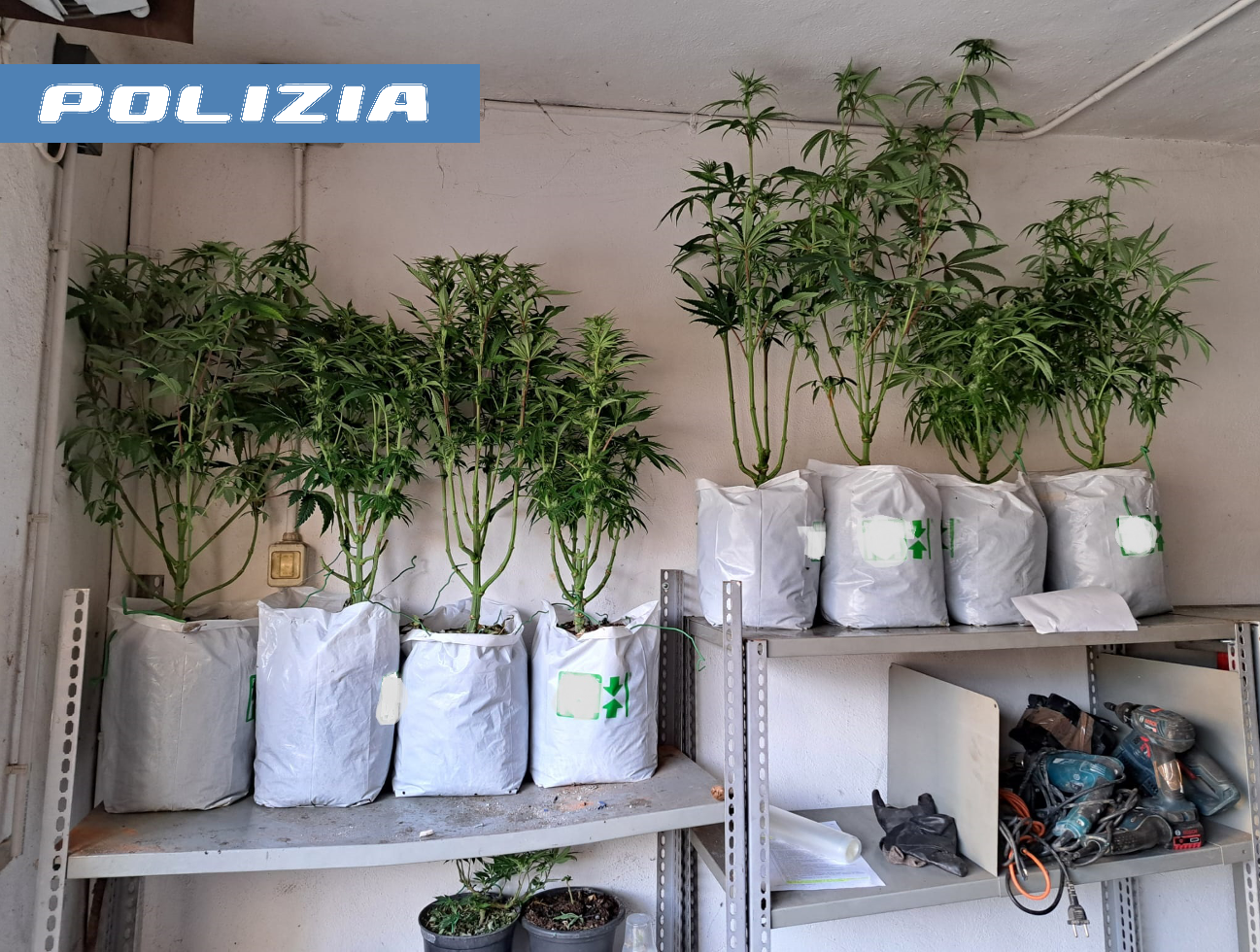 Nel corridoio dell’abitazione sono state rinvenute due serre con 21 vasi contenenti piante già pronte e germogli di marjuana di varie altezze e foglie essiccate. Nel box doccia sono stati recuperati diversi prodotti utilizzati per la coltivazione come fertilizzanti, terra, contenitore a led, sacchetti in tela per setacciare le piante e altri prodotti chimici.