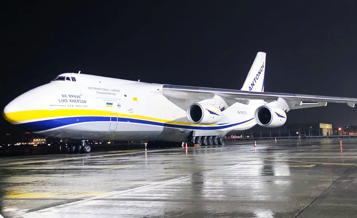Si tratta di uno giganteschi Antonov che vengono noleggiati dalla compagnia aerea ucraina Antonov Airlines. L’ Antonov An-124 è ad oggi l’aereo merci più grande del mondo in servizio con i suoi 69,10 m di lunghezza e un apertura alare di 73,30 m. e un peso a vuoto di 181 tonnellate per un peso massimo al decollo di 405 tonnellate.