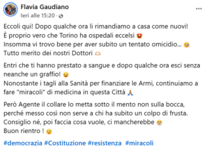 Sono saltate all’attenzione di alcuni le parole ironiche utilizzate dalla consigliera comunale Flavia Gaudiano dopo le dimissioni dall’ospedale di due poliziotti protagonisti e simbolo della difficile giornata torinese: