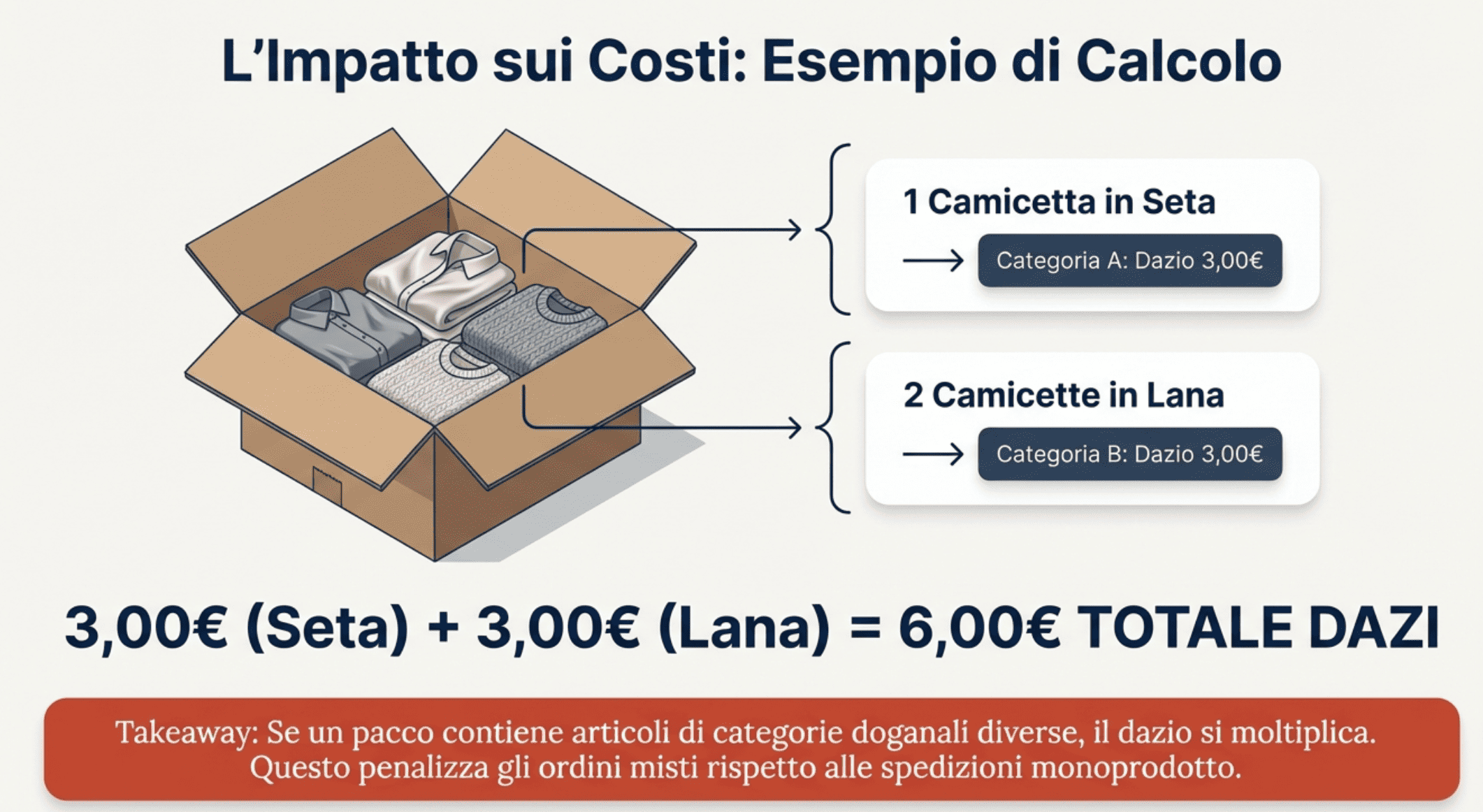 A differenza del dazio europeo da 3 euro, calcolato per categoria merceologica, la misura italiana si applica per spedizione al momento dello sdoganamento.