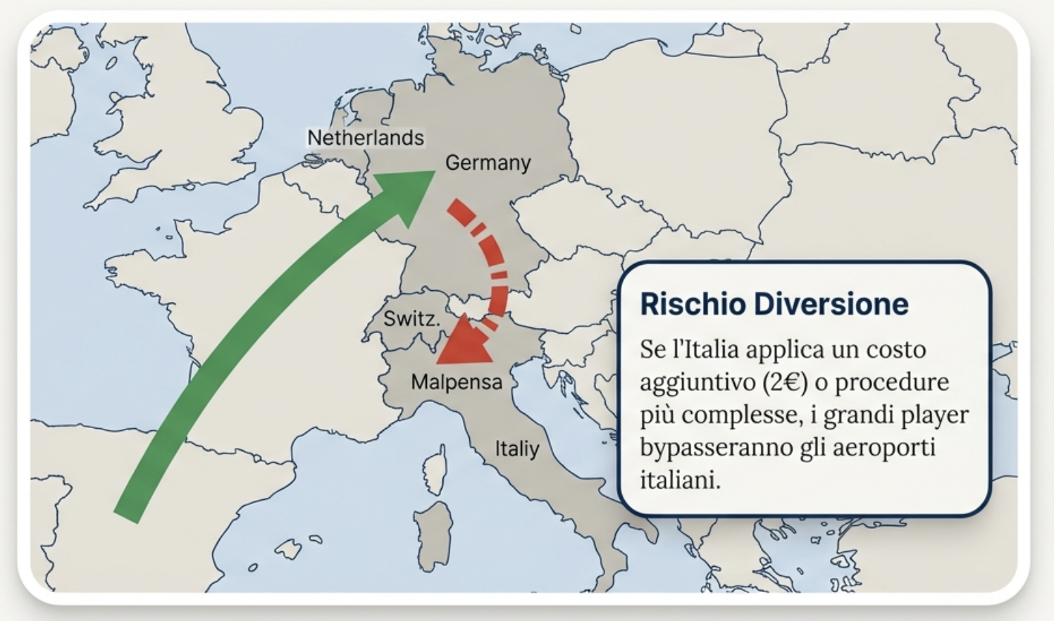 Il problema, come segnalato da operatori come Swissport Italia, è lo spostamento dei flussi cargo verso altri Paesi UE privi di un contributo simile, con effetti sull’operatività dell’Aeroporto di Milano Malpensa, che ha visto una riduzione dell’attività cargo. Contemporaneamente, è aumentato il traffico su gomma, più inquinante.