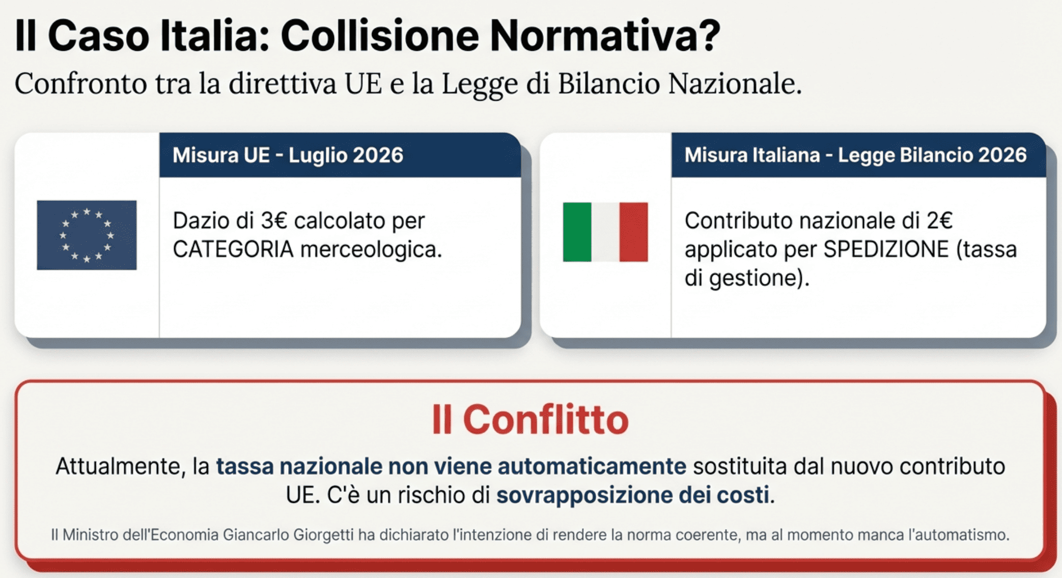 Come evidenziato da un’inchiesta di Wired Italia, l’Italia, ben prima della norma UE, ha introdotto un contributo nazionale di 2 euro sui pacchi sotto i 150 euro provenienti da Paesi extra UE, previsto dalla Legge di Bilancio 2026 dal governo guidato da Giorgia Meloni.
