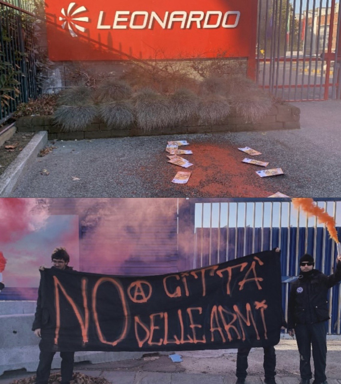 Un’ulteriore azione dimostrativa è stata messa in atto davanti alla sede di Leonardo in corso Francia: qui, secondo quanto dichiarato dal gruppo, è stato inscenato simbolicamente un “lago di sangue” con banconote lasciate all’ingresso e uno striscione con la scritta “Spezziamo le ali al militarismo”.