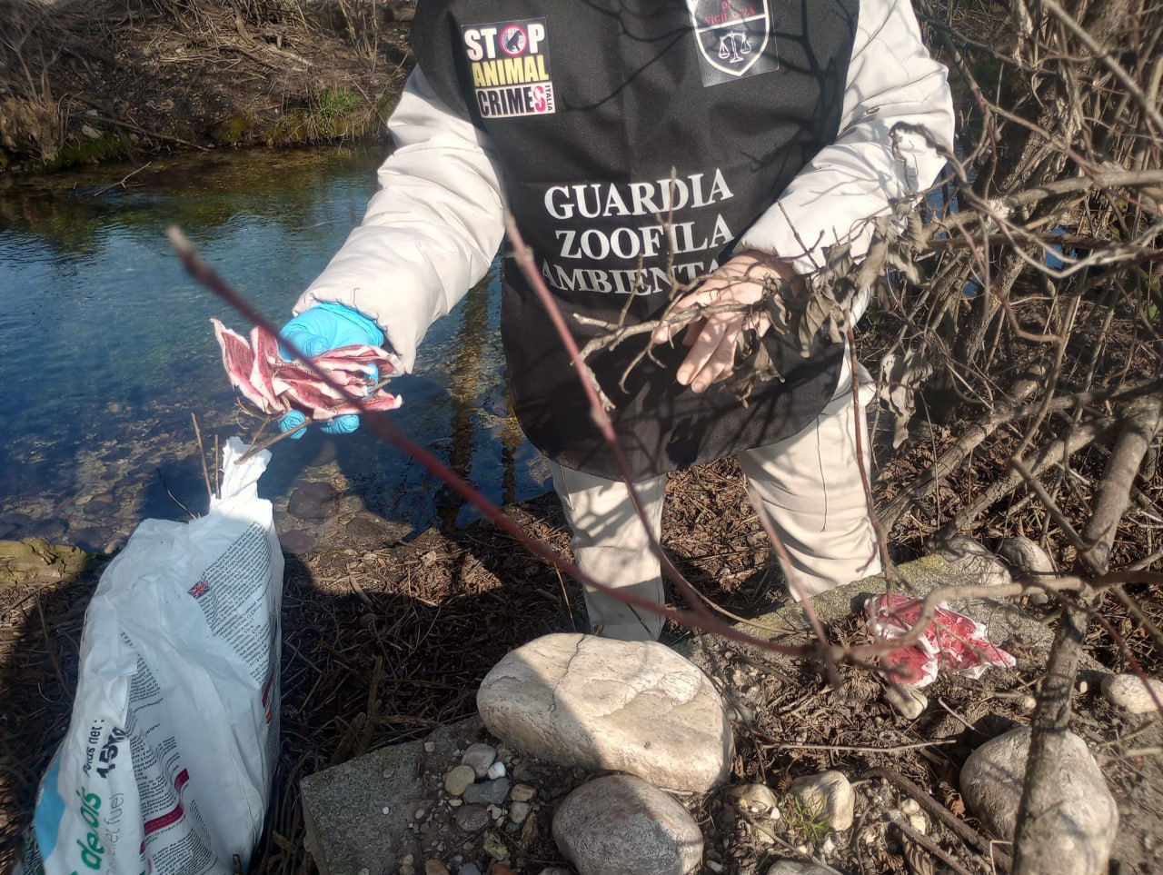 Nel corso dei controlli sono state rinvenute circa 400 bustine di veleno per topi. Il materiale era disseminato lungo un canale che conduce all’allevamento di trote Fariano: piccoli gruppi di esche erano collocati a intervalli regolari di circa cinque metri, in corrispondenza dei varchi tra i rovi che permettono l’accesso all’acqua. Alcune bustine risultavano già aperte o parzialmente consumate, altre erano finite nel canale, anche in prossimità dell’allevamento.