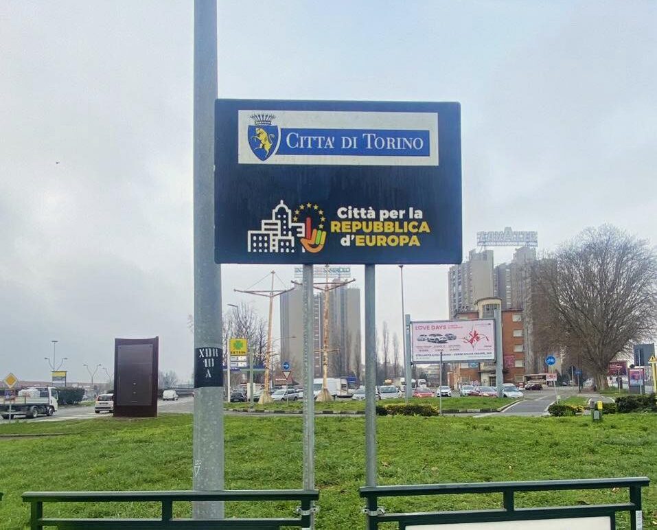 “Città per la Repubblica d’Europa”, riposizionato il cartello (scomparso) sulla rotonda di corso Giulio a Torino
