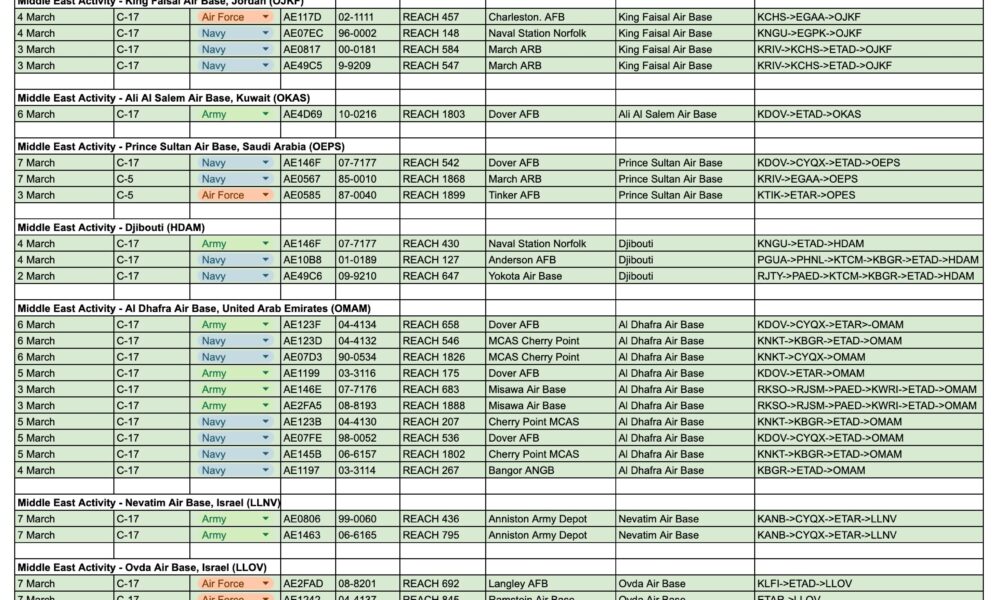 7 March – 2057zAs of the 7th March there have been 457 U.S. Air Force C-17/C-5 flights related to the build-up, and now sustainment, of combat operations in Iran.… https://t.co/gnYAQsX8IZ pic.twitter.com/XaIhZxlExt