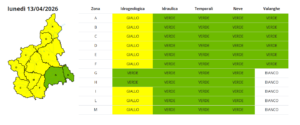 Il Centro Funzionale di Arpa Piemonte ha emesso, per la giornata di oggi, una allerta gialla per rischio idrogeologico sui settori settentrionali (zone A e B) e occidentali (zone C, D, E ed F) e sulle pianure (zone I, L e M). Su tali zone potrebbero verificarsi locali allagamenti ed isolati fenomeni di versante.