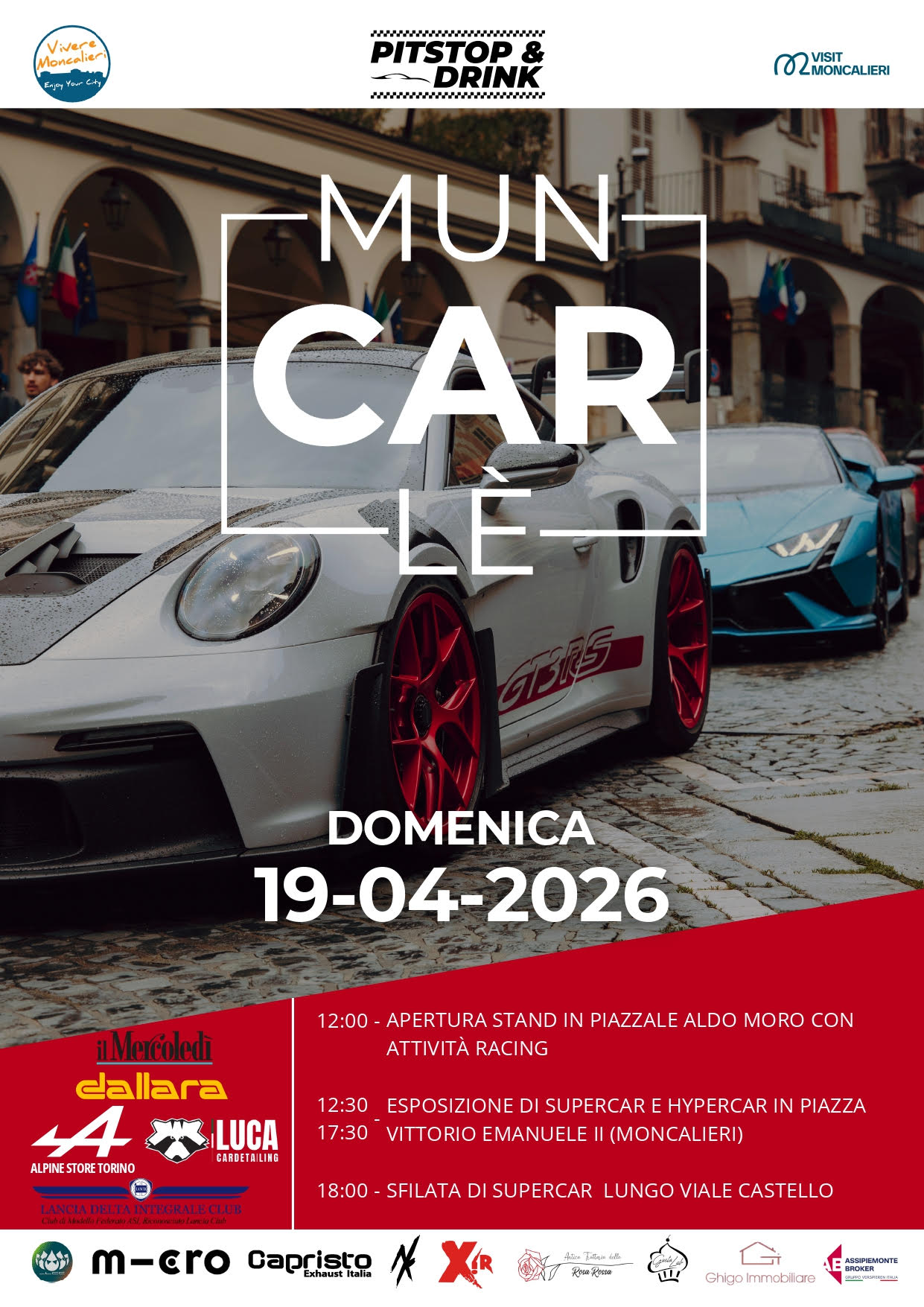 MONCALIERI – Torna a Moncalieri uno degli eventi più attesi dagli appassionati di motori. Domenica 19 aprile, dalle 12 alle 18, il centro storico ospiterà la terza edizione di “MunCARlè”, la manifestazione dedicata al mondo automotive organizzata da PitStop & Drink e Vivere Moncalieri.