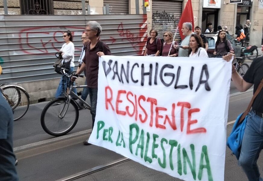Qui gli attivisti si sono fermati per compiere azioni dal forte senso evocativo: una bandiera israeliana, portata appositamente sul posto dagli stessi manifestanti, è stata strappata e calpestata sulla sede stradale. Contestualmente, sull’asfalto è comparsa a caratteri cubitali bianchi la scritta “Israele genocida”.
