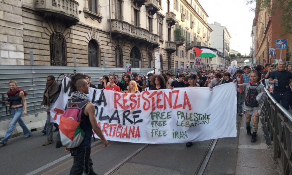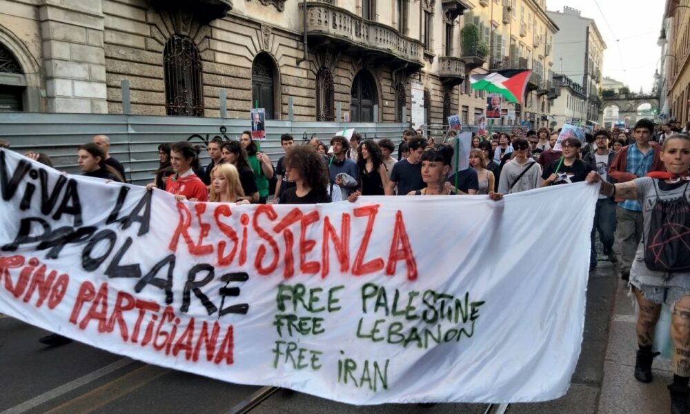 Lo striscione “Viva la resistenza popolare. Torino partigiana. Free Palestine – Free Lebanon – Free Iran” chiariva la posizione dei manifestanti
