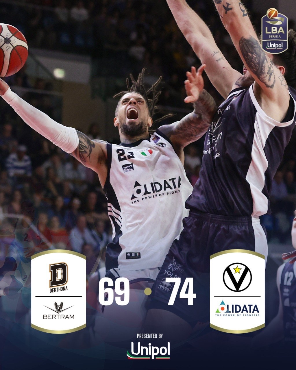 TORTONA – Partita molto combattuta alla Nova Arena di Tortona quella valida per la 27ma giornata di Serie A maschile. Dopo un finale thriller, a spuntarla è la Virtus Olidata Bologna: 69 a 74 il punteggio finale.