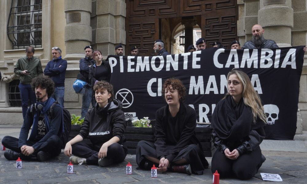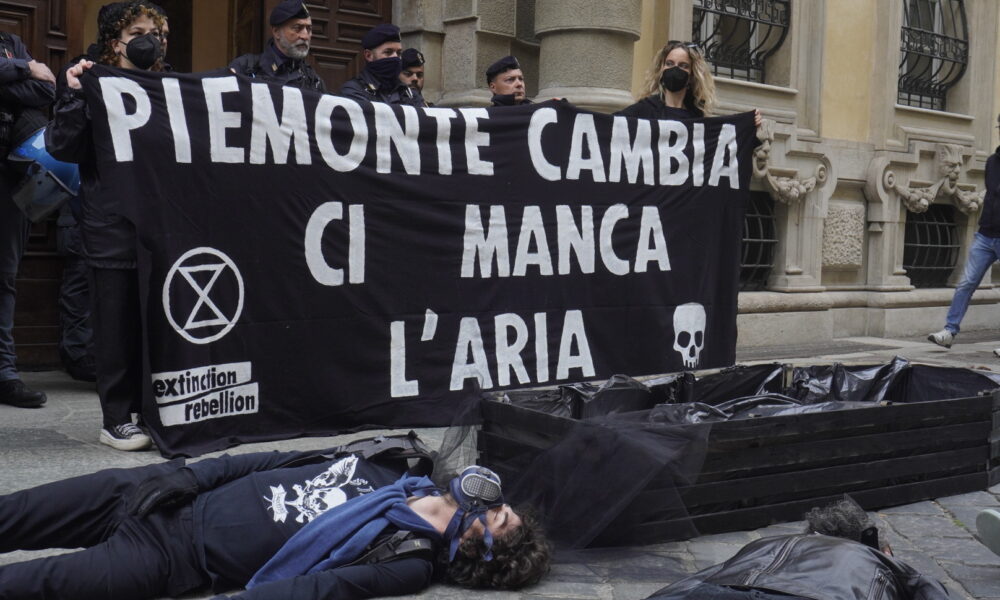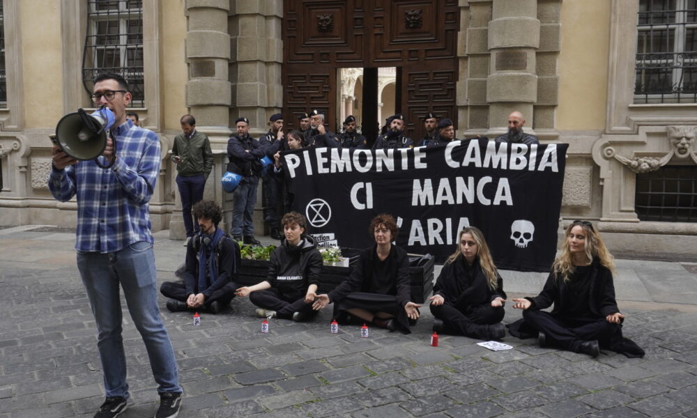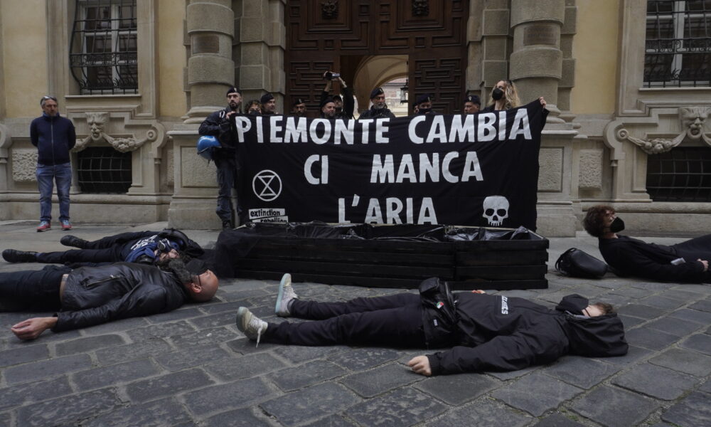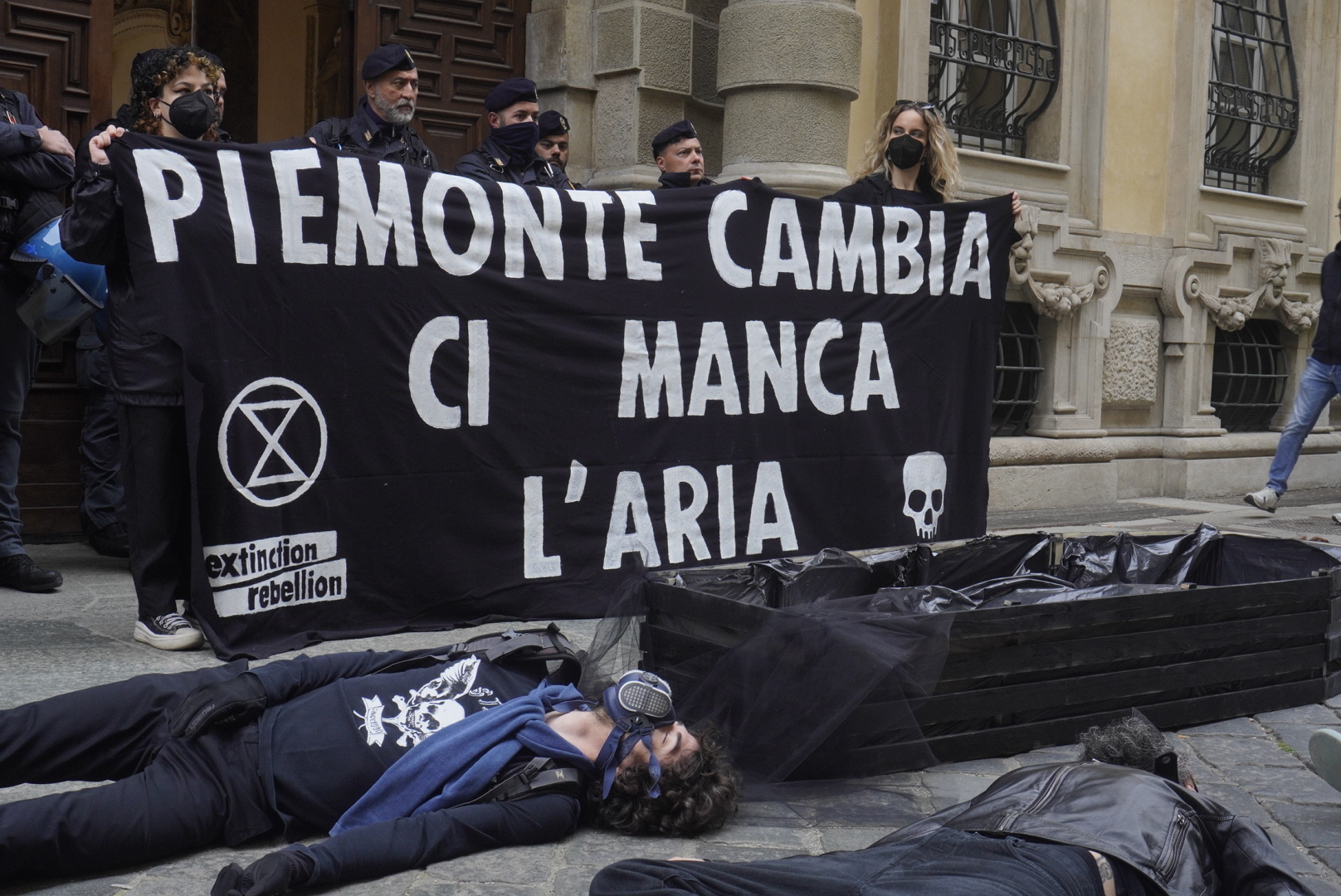 TORINO – “Piemonte cambia: ci manca l’aria”. Lo striscione esposto questa mattina dai manifestanti di Extinction Rebellion di fronte a Palazzo Lascaris a Torino allude «alla mancanza di politiche strutturali per la riduzione dell’inquinamento» e alla «paralisi dei lavori a causa delle scandalo Chiorino-Delmastro».
