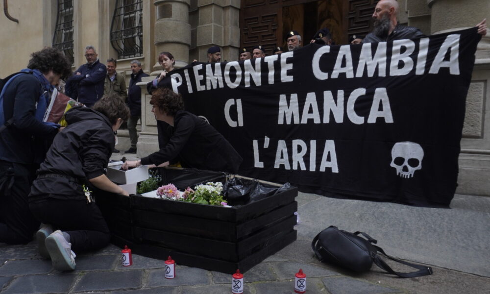 Il presidio di protesta si è attivato poco prima che iniziasse la seduta del Consiglio Regionale, che ha sede proprio a Palazzo Lascaris: qui, una decina di persone, vestite di nero e con il viso coperto da mascherine antismog, ha affisso lo striscione e depositato una bara di fronte all’ingresso. «Oggi abbiamo due emergenze» – spiegano gli attivisti – «una che occupa le prime pagine e una che riempie i nostri polmoni. Ogni anno solo a Torino più di 900 persone muoiono a causa dell’inquinamento atmosferico. Una strage silenziosa, costante, di cui non si parla. Sono morti premature, in gran parte evitabili. Questa è la crisi di cui la Regione dovrebbe occuparsi. Invece il Consiglio è bloccato da settimane dai suoi stessi scandali e continua a rimandare politiche strutturali serie per ridurre lo smog».