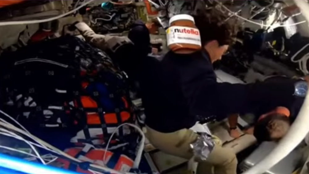 Quando mancavano 3 minuti e 51 secondi al superamento del record di distanza dalla Terra raggiunta da umani è improvvisamente comparso nell’inquadratura un barattolo di Nutella che, grazie all’assenza di gravità, ha attraversato lo spazio fluttuando nello spazio interno della capsula Orion per poi finire dall’altra parte della caspula e dell’inquadratura.