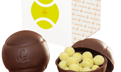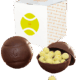 Una pallina da tennis in cioccolato fondente piena di chicchi di caffè ricoperti da cioccolato fondente e bianco